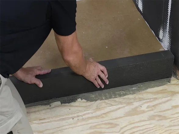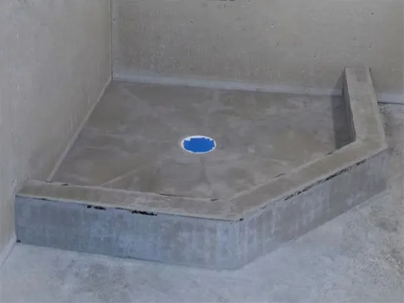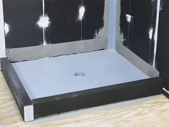 Die Duschkante besteht aus extrudiertem Polystyrol (XPS), verstärkt und auf vier Seiten mit einem Glasfaser -Netz in einem dünnen Zementpolymermörser bedeckt. Eine Seite kann auf Anfrage nach einer besseren Verbindung vorgeschnitten werden.