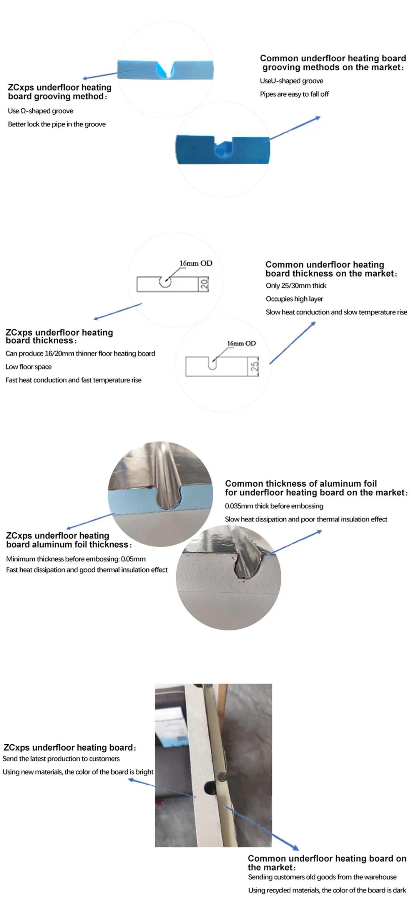 Dieses Unterbodenheiztafel besteht aus EPS -Panels mit hoher Dichte, die bis zu 400 kPa Druckfestigkeit beträgt. Die Super Slim 20mm EPS -Panel kann die Bodenhöhe minimieren. Das Endradius -Design macht es flexibel für Rohrleitungen. Die Bretter werden mit einer Aluminiumfolie von 0,1/0,2 mm laminiert, die eine perfekte thermische Leitfähigkeit für diffuse Hitze gleichmäßig und nach oben aufweisen, die Ihren Boden in 30 Minuten wärmen können, viel schneller als die herkömmliche Erwärmung des nassen Bodens. Die Oberflächentemperatur ist 3-4Chigher als herkömmliche Erheizung des nassen Bodens, was eher für Luftwärmepumpen mit niedrigem Wasser und energieeffizienter geeignet ist.